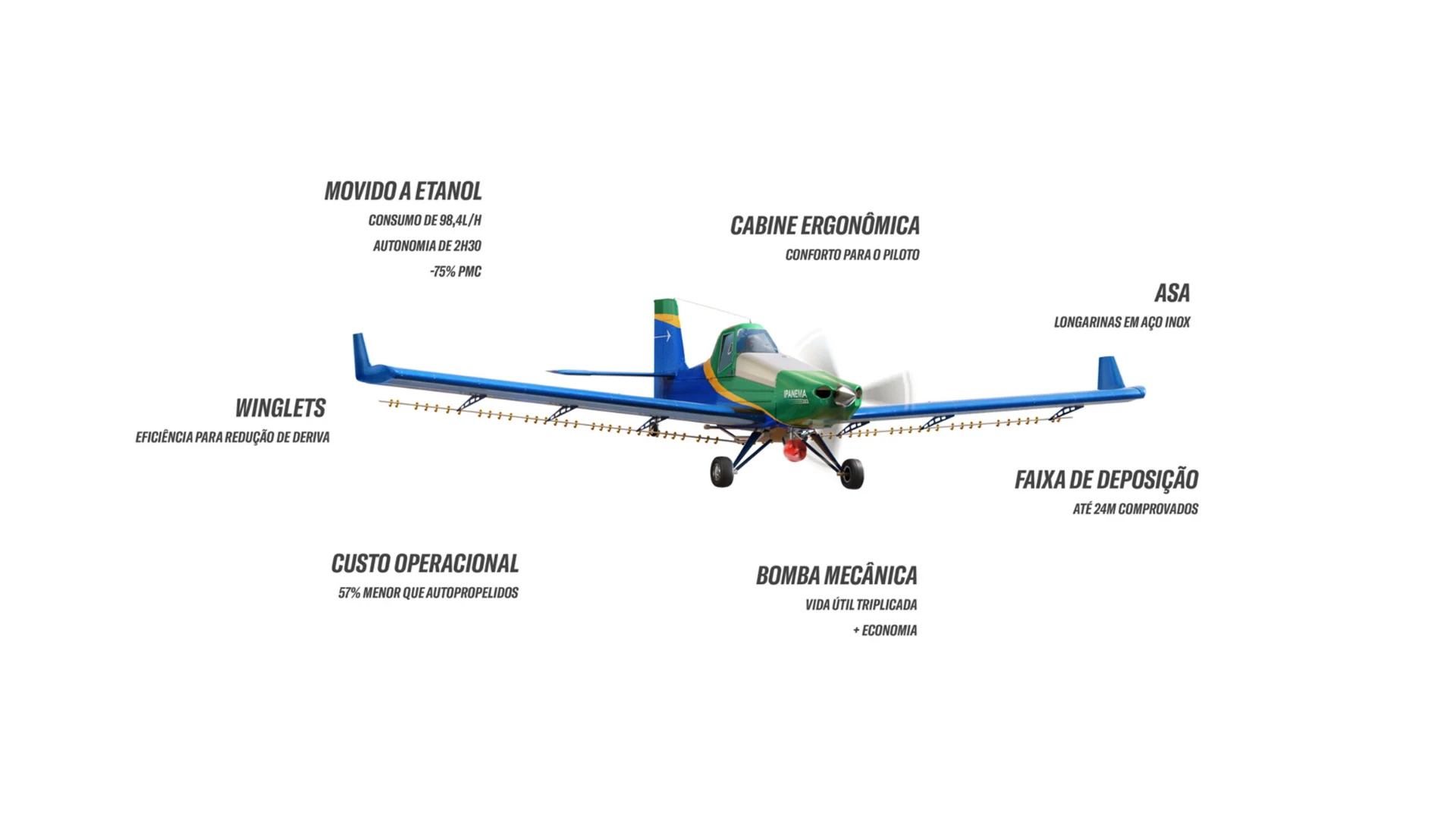 O Ipanema 203 é o avião perfeito para você pulverizar com eficiência e baixo custo, deixando pra trás o uso de autopropelidos. A aeronave tem velocidade constante, pulveriza até 200 hectares por hora com uniformidade e precisão e pode ser usado depois da chuva e em solos molhados, irrigados ou encharcados.