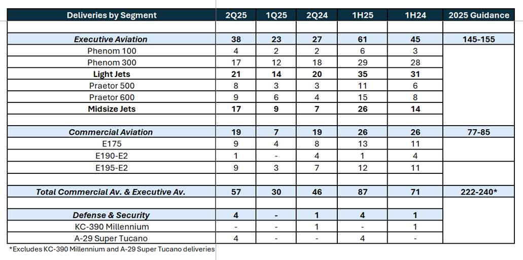 Deliveries in Commercial Aviation maintained the same volume as in 2Q24, totaling 19 aircraft. Compared to 1Q25, deliveries rose 171%. In Executive Aviation, deliveries reached 38 aircraft and surpassed the number from a year ago by 41%, while increasing 65% over 1Q25. The company also delivered 4 A-29 Super Tucano aircraft in the Defense & Security segment, bringing the total number of airplanes in the quarter to 61.