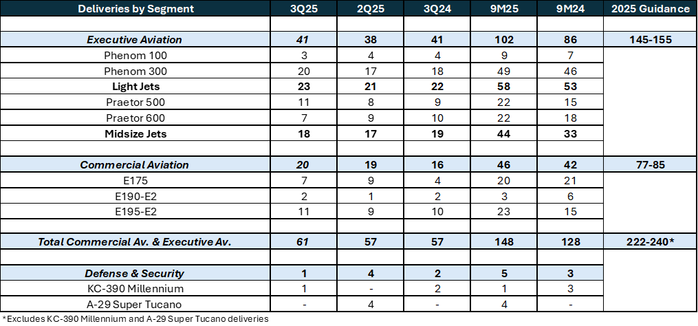 São Paulo (SP), Brazil, October 2, 2025 – Embraer (NYSE: ERJ / B3: EMBR3), a global leader in the aerospace industry, delivered 62 aircraft in 3Q25. The result represented a marginal improvement compared to 2Q25 and 3Q24, when 61 and 59 jets were delivered, respectively.