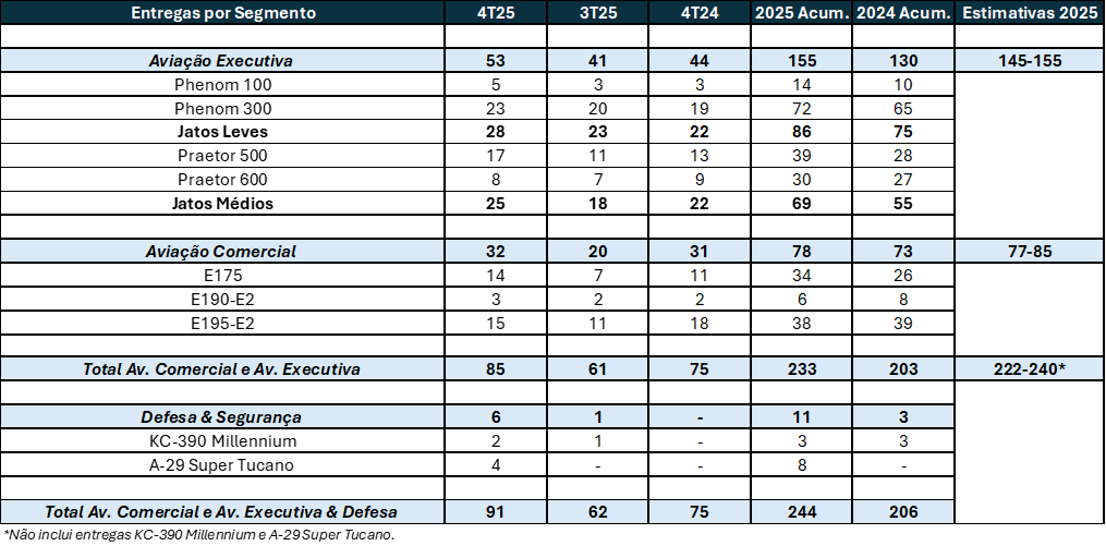 No ano de 2025, a empresa entregou um total de 244 aeronaves na Aviação Comercial, Aviação Executiva e Defesa & Segurança, acima das 206 unidades entregues no ano anterior.